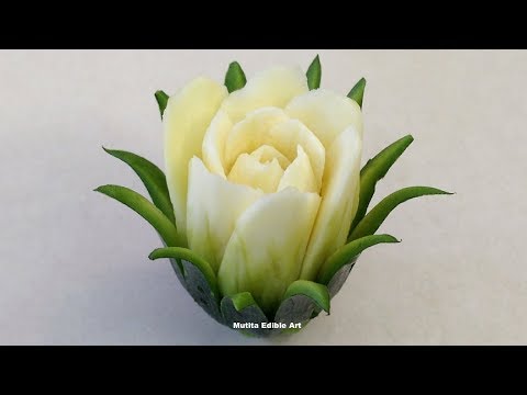 Mời các bạn xem cách tỉa hoa hồng trắng từ những trái bí ngòi. Thật công phu nhưng cũng rất bõ công với một bông hoa hàm tiếu, trắng nuốt và thật sinh động như bông hoa này phải không các bạn?