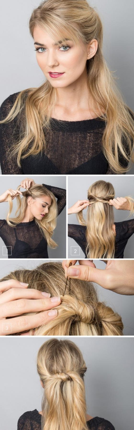 - Gắn kết hai phần tóc vừa xoắn với nhau bằng cách buộc thắt nút chúng lại sau đó dùng kẹp tóc cố định là hoàn thành.